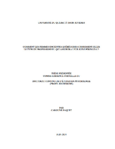 Paquet, Caroline (2024). Comment les femmes enceintes québécoises choisissent-elles le type de professionnel qui assurera leur suivi périnatal? Thèse. Trois-Rivières, Université du Québec à Trois-Rivières, 308 p.