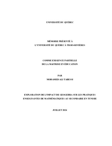 Tabessi, Mohamed Ali (2024). Exploration de l'impact de GeoGebra sur les pratiques enseignantes de mathématiques au secondaire en Tunisie. Mémoire. Trois-Rivières, Université du Québec à Trois-Rivières, 138 p.