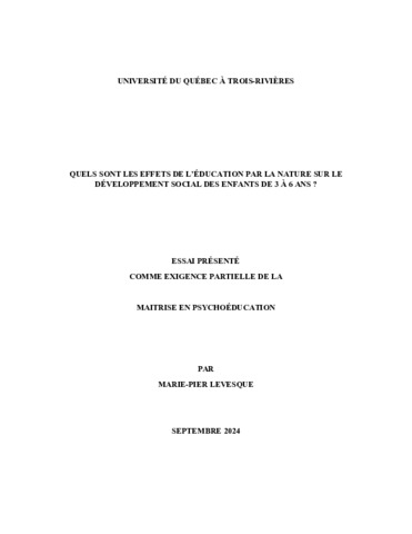 Lévesque, Marie-Pier (2024). Quels sont les effets de l’éducation par la nature sur le développement social des enfants de 3 à 6 ans ? Essai. Trois-Rivières, Université du Québec à Trois-Rivières, 46 p.