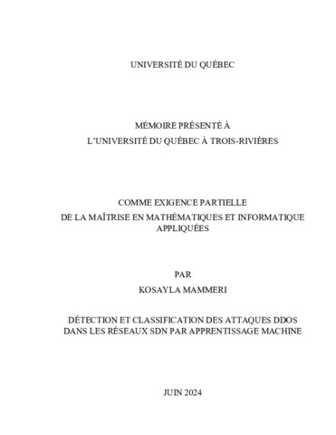 Mammeri, Kosayla (2024). Détection et classification des attaques DDoS dans les réseaux SDN par apprentissage machine. Mémoire. Trois-Rivières, Université du Québec à Trois-Rivières, 83 p.