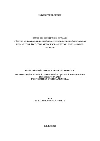 Dieye, El Hadji Mouhamadou (2024). Étude des conceptions initiales d'élèves Sénégalais de la sixième année de l'école élémentaire au regard d'une éducation aux sciences : l'exemple de l'appareil digestif. Thèse. Trois-Rivières;Montréal, Université du Québec à Trois-Rivières;Université du Québec à Montréal, 174 p.