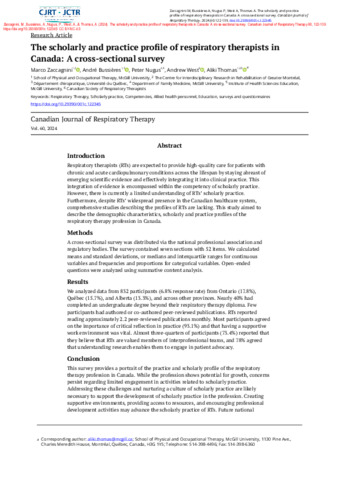 Zaccagnini, M., Bussières, A., Nugus, P., West, A. et Thomas, A. (2024). The scholarly and practice profile of respiratory therapists in Canada: A cross-sectional survey. Canadian Journal of Respiratory Therapy, 60 . pp. 122-139. DOI 10.29390/001c.122345