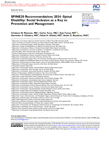 Menezes, C. M., Tucci, C., Tamai, K., Chhabra, H. S., Alhelal, F. H., Bussières, A. E., Muehlbauer, E. J., Roberts, L., Alsobayel, H. I., Barneschi, G., Campello, M. A., Côté, P., Duchén Rodríguez, L. M., Cristante, A. F., Kamra, K., Kitamura, K., Meves, R., Risso-Neto, M. I., Vlok, A. J., Wadhwa, S., Wiechert, K., Yurac, R., Blattert, T., Costanzo, G., Darwono, B., Nordin, M., Al Athbah, Y. S., Alturkistany, A., Chahal, R., Franke, J., Ito, M., Arand, M., Pereira, P., Ruosi, C., Sullivan, W. J., Andújar, A. L. F., Ribeiro, C. H., Carelli, L. E., Sardá, J., Machado, A. L. G. E. et AlEissa, S. (2024). SPINE20 recommendations 2024 -Spinal disability: Social inclusion as a key to prevention and management. Global Spine Journal . ISSN 2192-5682 2192-5690 DOI 10.1177/21925682241290226