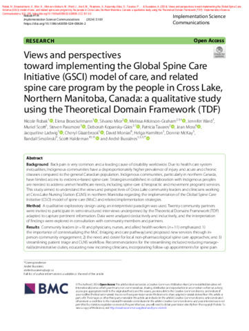 Robak, N., Broeckelmann, E., Mior, S., Atkinson-Graham, M., Ward, J., Scott, M., Passmore, S., Kopansky-Giles, D., Tavares, P., Moss, J., Ladwig, J., Glazebrook, C., Monias, D., Hamilton, H., McKay, D., Smolinski, R., Haldeman, S. et Bussières, A. (2024). Views and perspectives toward implementing the Global Spine Care Initiative (GSCI) model of care, and related spine care program by the people in Cross Lake, Northern Manitoba, Canada: A qualitative study using the Theoretical Domain Framework (TDF). Implementation Science Communications, 5 (1). p. 100. ISSN 2662-2211 DOI 10.1186/s43058-024-00636-2