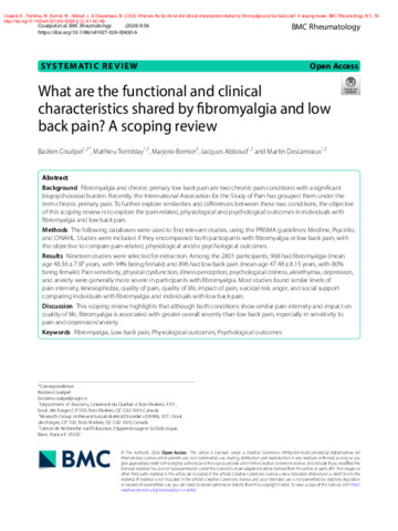 Couëpel, B., Tremblay, M., Bernier, M., Abboud, J. et Descarreaux, M. (2024). What are the functional and clinical characteristics shared by fibromyalgia and low back pain? A scoping review. BMC Rheumatology, 8 (1). p. 56. ISSN 2520-1026 DOI 10.1186/s41927-024-00430-6