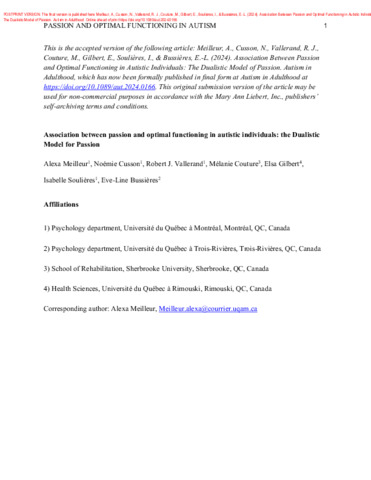 Meilleur, A., Cusson, N., Vallerand, R. J., Couture, M., Gilbert, E., Soulières, I. et Bussières, E.-L. (2024). Association between passion and optimal functioning in autistic individuals: The dualistic model of passion. Autism in Adulthood . ISSN 2573-9581 DOI 10.1089/aut.2024.0166