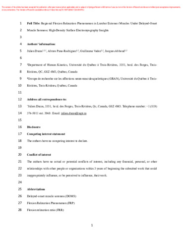Ducas, J., Pano-Rodriguez, A., Vadez, G. et Abboud, J. (2024). Regional flexion relaxation phenomenon in lumbar extensor muscles under delayed-onset muscle soreness: High-density surface electromyography insights. European Journal of Applied Physiology, 125 . pp. 1323-1336. ISSN 1439-6327 DOI 10.1007/s00421-024-05678-x