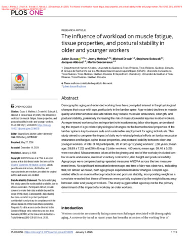 Ducas, J., Mathieu, J., Drouin, M., Sobczak, S., Abboud, J. et Descarreaux, M. (2025). The influence of workload on muscle fatigue, tissue properties, and postural stability in older and younger workers. PLOS ONE, 20 (1). e0316678. ISSN 1932-6203 DOI 10.1371/journal.pone.0316678