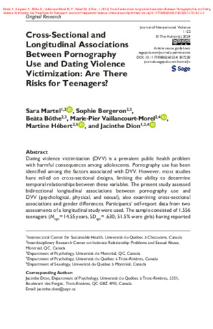 Martel, S., Bergeron, S., Bőthe, B., Vaillancourt-Morel, M.-P., Hébert, M. et Dion, J. (2024). Cross-sectional and longitudinal associations between pornography use and dating violence victimization: Are there risks for teenagers? Journal of Interpersonal Violence . ISSN 0886-2605 1552-6518 DOI 10.1177/08862605241307228