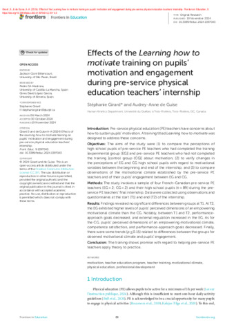 Girard, S. et de Guise, A.-A. (2024). Effects of the Learning how to motivate training on pupils’ motivation and engagement during pre-service physical education teachers’ internship. Frontiers in Education, 9 . ISSN 2504-284X DOI 10.3389/feduc.2024.1397043
