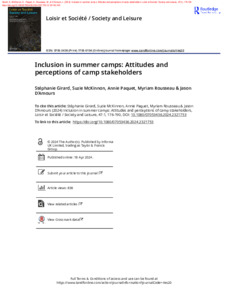 Girard, S., McKinnon, S., Paquet, A., Rousseau, M. et D’Amours, J. (2024). Inclusion in summer camps: Attitudes and perceptions of camp stakeholders. Loisir et Société / Society and Leisure, 47 (1). pp. 176-190. ISSN 0705-3436 1705-0154 DOI 10.1080/07053436.2024.2321753