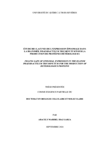 Diaz Garza, Aracely Maribel (2024). Étude des lacunes de l’expression épisomale dans la diatomée Phaeodactylum tricornutum pour la production de protéines hétérologues = Filling gaps of episomal expression in the diatom Phaeodactylum tricornutum for the production of heterologous proteins. Thèse. Trois-Rivières, Université du Québec à Trois-Rivières, 179 p.