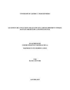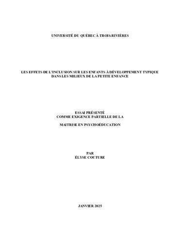 Couture, Élyse (2025). Les effets de l’inclusion sur les enfants à développement typique dans les milieux de la petite enfance. Essai. Trois-Rivières, Université du Québec à Trois-Rivières, 24 p.