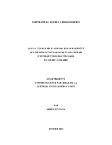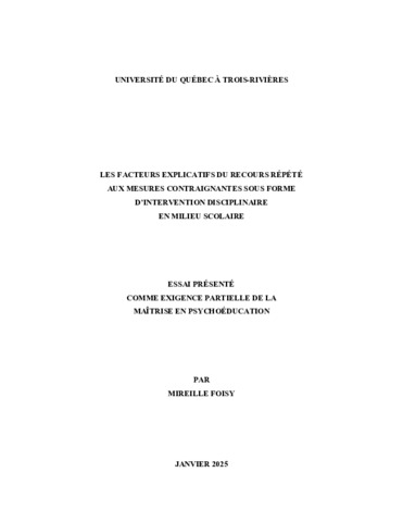 Foisy, Mireille (2025). Les facteurs explicatifs du recours répété aux mesures contraignantes sous forme d’intervention disciplinaire en milieu scolaire. Essai. Trois-Rivières, Université du Québec à Trois-Rivières, 28 p.