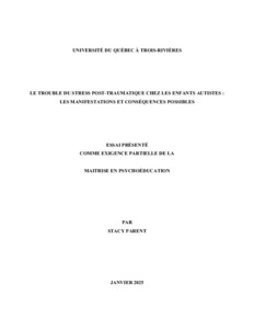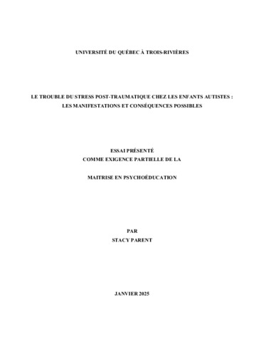 Parent, Stacy (2025). Le trouble du stress post-traumatique chez les enfants autistes : les manifestations et conséquences possibles. Essai. Trois-Rivières, Université du Québec à Trois-Rivières, 33 p.