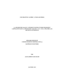 Marchand, Alexandre (2025). La seigneurie Massue : régime foncier et enrichissement capitaliste dans la région de Yamaska (1833-1854) à travers les archives notariales. Mémoire. Trois-Rivières, Université du Québec à Trois-Rivières, 150 p.