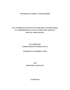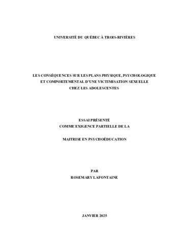 Lafontaine, Rosemary (2025). Les conséquences sur les plans physique, psychologique et comportemental d’une victimisation sexuelle chez les adolescentes. Essai. Trois-Rivières, Université du Québec à Trois-Rivières, 28 p.