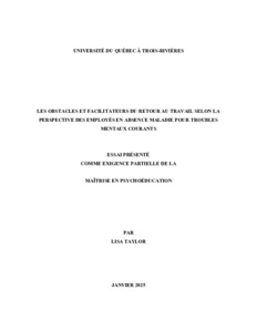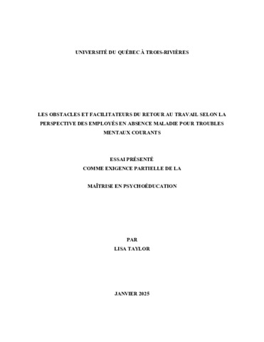 Taylor, Lisa (2025). Les obstacles et facilitateurs du retour au travail selon la perspective des employés en absence maladie pour troubles mentaux courants. Essai. Trois-Rivières, Université du Québec à Trois-Rivières, 57 p.