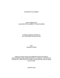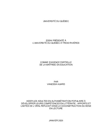 Huard, Vanessa (2025). Aider les adultes en alphabétisation populaire à développer leurs compétences en littératie : apports et limites de l’oral réflexif dans la coconstruction du sens en lecture. Essai. Trois-Rivières, Université du Québec à Trois-Rivières, 204 p.