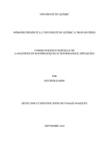 Kouider, Karim (2024). Détection et identification de visages masqués. Mémoire. Trois-Rivières, Université du Québec à Trois-Rivières, 132 p.