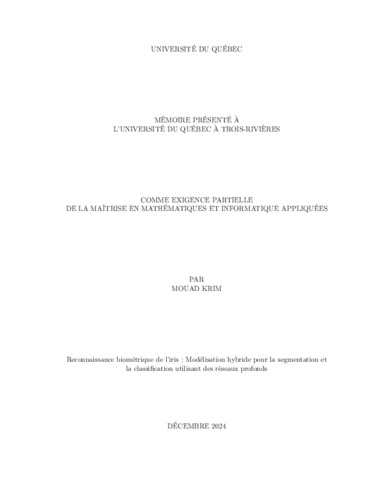 Krim, Mouad (2024). Reconnaissance biométrique de l’iris : modélisation hybride pour la segmentation et la classification utilisant des réseaux profonds. Mémoire. Trois-Rivières, Université du Québec à Trois-Rivières, 66 p.