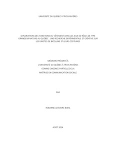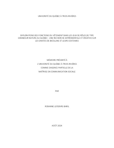 Lefebvre-Baril, Roxanne (2024). Explorations des fonctions du vêtement dans les jeux de rôles de type grandeur nature au Québec : une recherche expérimentale et créative sur les GNistes de Bicolline et leurs costumes. Mémoire. Trois-Rivières, Université du Québec à Trois-Rivières, 144 p.
