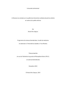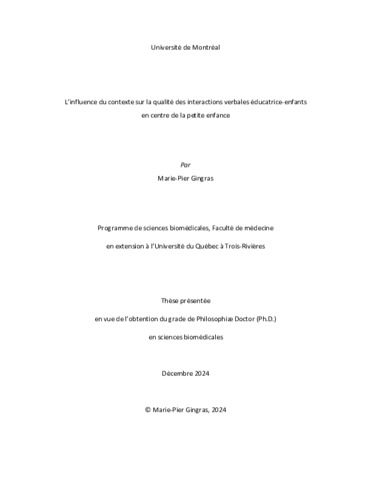 Gingras, Marie-Pier (2024). L’influence du contexte sur la qualité des interactions verbales éducatrice-enfants en centre de la petite enfance. Thèse. Montréal, Université de Montréal, 161 p.