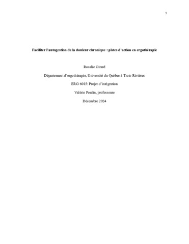 Girard, Rosalie (2024). Faciliter l’autogestion de la douleur chronique : pistes d’action en ergothérapie. Essai. Trois-Rivières, Université du Québec à Trois-Rivières, 65 p.