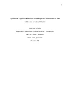 Robitaille, Marie-Jane (2024). Exploration de l’approche Montessori et son effet auprès des enfants autistes en milieu scolaire : une revue de la littérature. Essai. Trois-Rivières, Université du Québec à Trois-Rivières, 54 p.