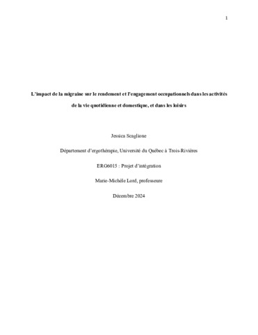 Scaglione, Jessica (2024). L’impact de la migraine sur le rendement et l’engagement occupationnels dans les activités de la vie quotidienne et domestique, et dans les loisirs. Essai. Trois-Rivières, Université du Québec à Trois-Rivières, 86 p.