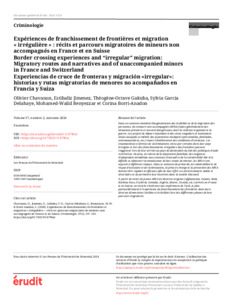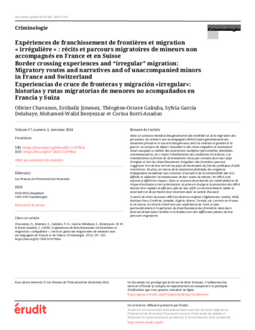 Chavanon, O., Jimenez, E., Gakuba, T.-O., Garcia Delahaye, S., Benyezzar, M.-W. et Borri-Anadon, C. (2024). Expériences de franchissement de frontières et migration « irrégulière » : récits et parcours migratoires de mineurs non accompagnés en France et en Suisse. Criminologie, 57 (2). pp. 217-241. ISSN 0316-0041 DOI 10.7202/1114790ar