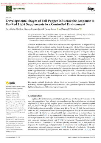 Mouliom-Ntapnze, A. M., Fangue-Yapseu, G. Y. et Missihoun, T. D. (2025). Developmental stages of bell pepper influence the response to far-red light supplements in a controlled environment. Agronomy, 15 (3). p. 732. ISSN 2073-4395 DOI 10.3390/agronomy15030732