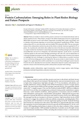 Tola, A. J., Jaballi, A. et Missihoun, T. D. (2021). Protein carbonylation: Emerging roles in plant redox biology and future prospects. Plants, 10 (7). Article 10071451. ISSN 2223-7747 DOI 10.3390/plants10071451