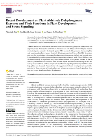 Tola, A. J., Jaballi, A., Germain, H. et Missihoun, T. D. (2021). Recent development on plant aldehyde dehydrogenase enzymes and their functions in plant development and stress signaling. Genes, 12 (1). Article 12010051. ISSN 2073-4425 DOI 10.3390/genes12010051