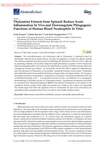 Beaupré, V., Boucher, N. et Desgagné-Penix, I. (2020). Thykamine extracts from spinach reduce acute inflammation in vivo and downregulate phlogogenic functions of human blood neutrophils in vitro. Biomedicines, 8 (7). Article 219. ISSN 2227-9059 DOI 10.3390/biomedicines8070219
