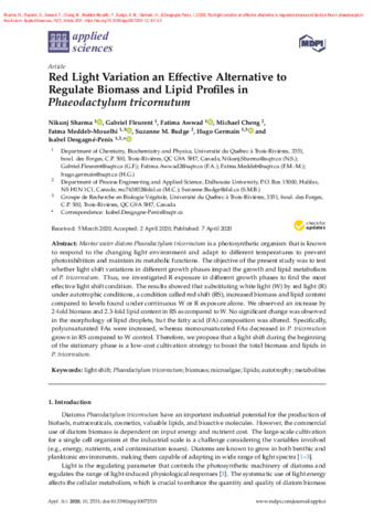 Sharma, N., Fleurent, G., Awwad, F., Cheng, M., Meddeb-Mouelhi, F., Budge, S. M., Germain, H. et Desgagné-Penix, I. (2020). Red light variation an effective alternative to regulate biomass and lipid profiles in phaeodactylum tricornutum. Applied Sciences, 10 (7). Article 2531. ISSN 2076-3417 DOI 10.3390/app10072531