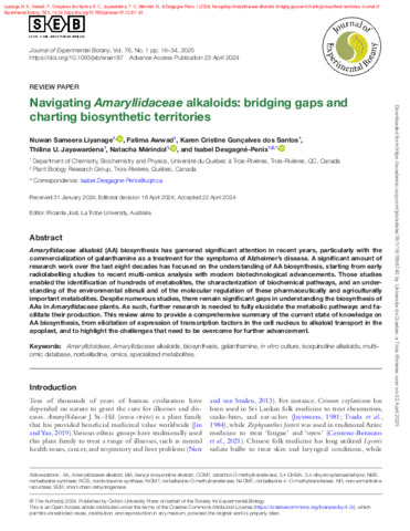 Liyanage, N. S., Awwad, F., Gonçalves Dos Santos, K. C., Jayawardena, T. U., Merindol, N. et Desgagné-Penix, I. (2024). Navigating Amaryllidaceae alkaloids: Bridging gaps and charting biosynthetic territories. Journal of Experimental Botany, 76 (1). pp. 16-34. ISSN 0022-0957 1460-2431 DOI 10.1093/jxb/erae187