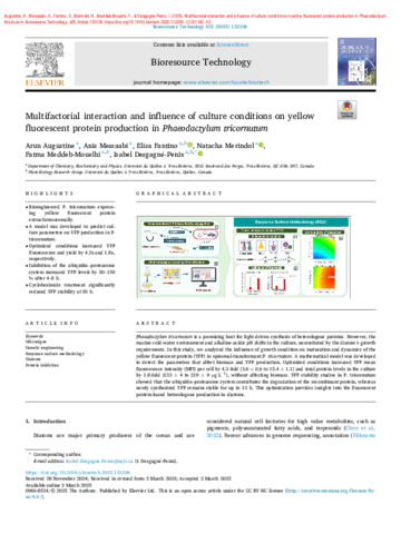 Augustine, A., Messaabi, A., Fantino, E., Merindol, N., Meddeb-Mouelhi, F. et Desgagné-Penix, I. (2025). Multifactorial interaction and influence of culture conditions on yellow fluorescent protein production in Phaeodactylum tricornutum. Bioresource Technology, 425 . Article 132336. ISSN 0960-8524 1873-2976 DOI 10.1016/j.biortech.2025.132336