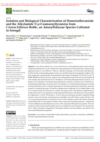 Masi, M., Koirala, M., Delicato, A., Di Lecce, R., Merindol, N., Ka, S., Seck, M., Tuzi, A., Desgagné‐Penix, I., Calabrò, V. et Evidente, A. (2021). Isolation and biological characterization of homoisoflavanoids and the alkylamide n‐p‐coumaroyltyramine from crinum biflorum rottb., an amaryllidaceae species collected in Senegal. Biomolecules, 11 (9). Article 1298. ISSN 2218-273X DOI 10.3390/biom11091298