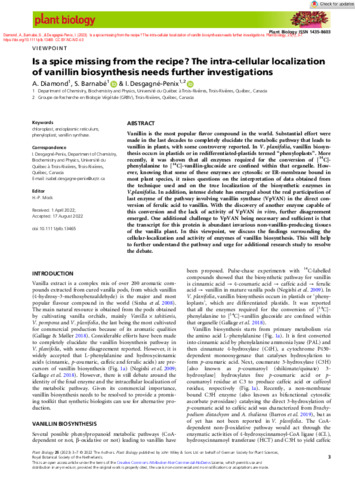 Diamond, A., Barnabé, S. et Desgagné-Penix, I. (2023). Is a spice missing from the recipe? The intra-cellular localization of vanillin biosynthesis needs further investigations. Plant Biology, 25 (1). pp. 3-7. ISSN 1435-8603 1438-8677 DOI 10.1111/plb.13465