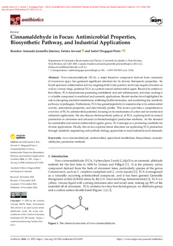 Jaramillo Jimenez, B. A., Awwad, F. et Desgagné-Penix, I. (2024). Cinnamaldehyde in focus: Antimicrobial properties, biosynthetic pathway, and industrial applications. Antibiotics, 13 (11). Article 1095. ISSN 2079-6382 DOI 10.3390/antibiotics13111095