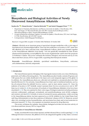 Ka, S., Koirala, M., Mérindol, N. et Desgagné-Penix, I. (2020). Biosynthesis and biological activities of newly discovered Amaryllidaceae alkaloids. Molecules, 25 (21). Article 4901. ISSN 1420-3049 DOI 10.3390/molecules25214901