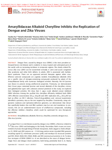Ka, S., Merindol, N., Sow, A. A., Singh, A., Landelouci, K., Plourde, M. B., Pépin, G., Masi, M., Di Lecce, R., Evidente, A., Seck, M., Berthoux, L., Chatel-Chaix, L. et Desgagné-Penix, I. (2021). Amaryllidaceae alkaloid cherylline inhibits the replication of dengue and Zika viruses. Antimicrobial Agents and Chemotherapy, 65 (9). Article 00398-21. ISSN 0066-4804 1098-6596 DOI 10.1128/aac.00398-21