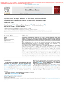Normand, M., Effatparvar, M. R., Lavoie, F.-A., Brismée, J.-M. et Sobczak, S. (2025). Distribution of strength potential of the thumb muscles and their relationship to trapeziometacarpal osteoarthritis: An exploratory cadaveric study. Clinical Biomechanics, 124 . Article 106489. ISSN 0268-0033 1879-1271 DOI 10.1016/j.clinbiomech.2025.106489
