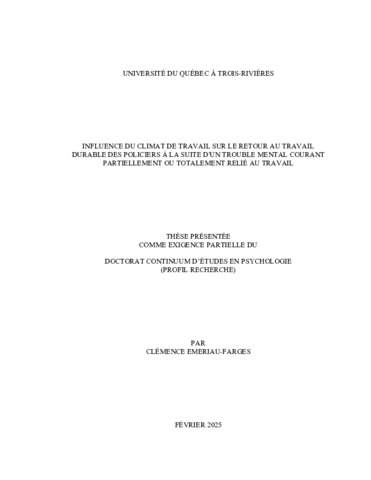 Emeriau-Farges, Clémence (2025). Influence du climat de travail sur le retour au travail durable des policiers à la suite d'un trouble mental courant partiellement ou totalement relié au travail. Thèse. Trois-Rivières, Université du Québec à Trois-Rivières, 237 p.