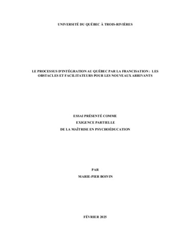 Boivin, Marie-Pier (2025). Le processus d’intégration au Québec par la francisation : les obstacles et facilitateurs pour les nouveaux arrivants. Essai. Trois-Rivières, Université du Québec à Trois-Rivières, 37 p.