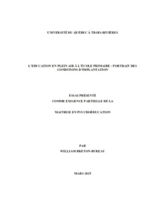 Breton-Bureau, William (2025). L’éducation en plein air à l’école primaire : portrait des conditions d’implantation. Essai. Trois-Rivières, Université du Québec à Trois-Rivières, 56 p.