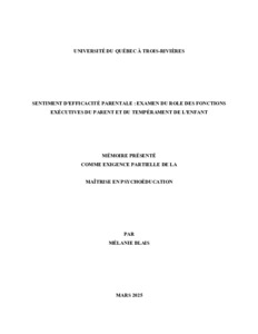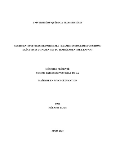 Blais, Mélanie (2025). Sentiment d'efficacité parentale : examen du rôle des fonctions exécutives du parent et du tempérament de l'enfant. Mémoire. Trois-Rivières, Université du Québec à Trois-Rivières, 63 p.