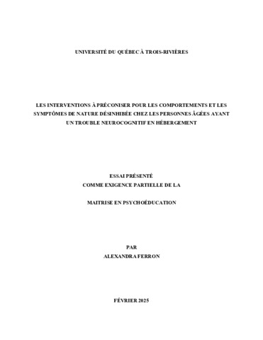 Ferron, Alexandra (2025). Les interventions à préconiser pour les comportements et les symptômes de nature désinhibée chez les personnes âgées ayant un trouble neurocognitif en hébergement. Essai. Trois-Rivières, Université du Québec à Trois-Rivières, 35 p.