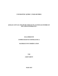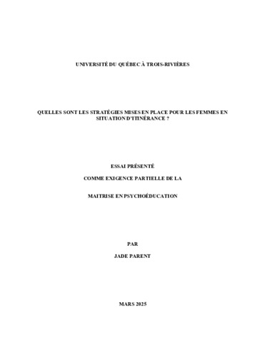 Parent, Jade (2025). Quelles sont les stratégies mises en place pour les femmes en situation d’itinérance ? Essai. Trois-Rivières, Université du Québec à Trois-Rivières, 42 p.